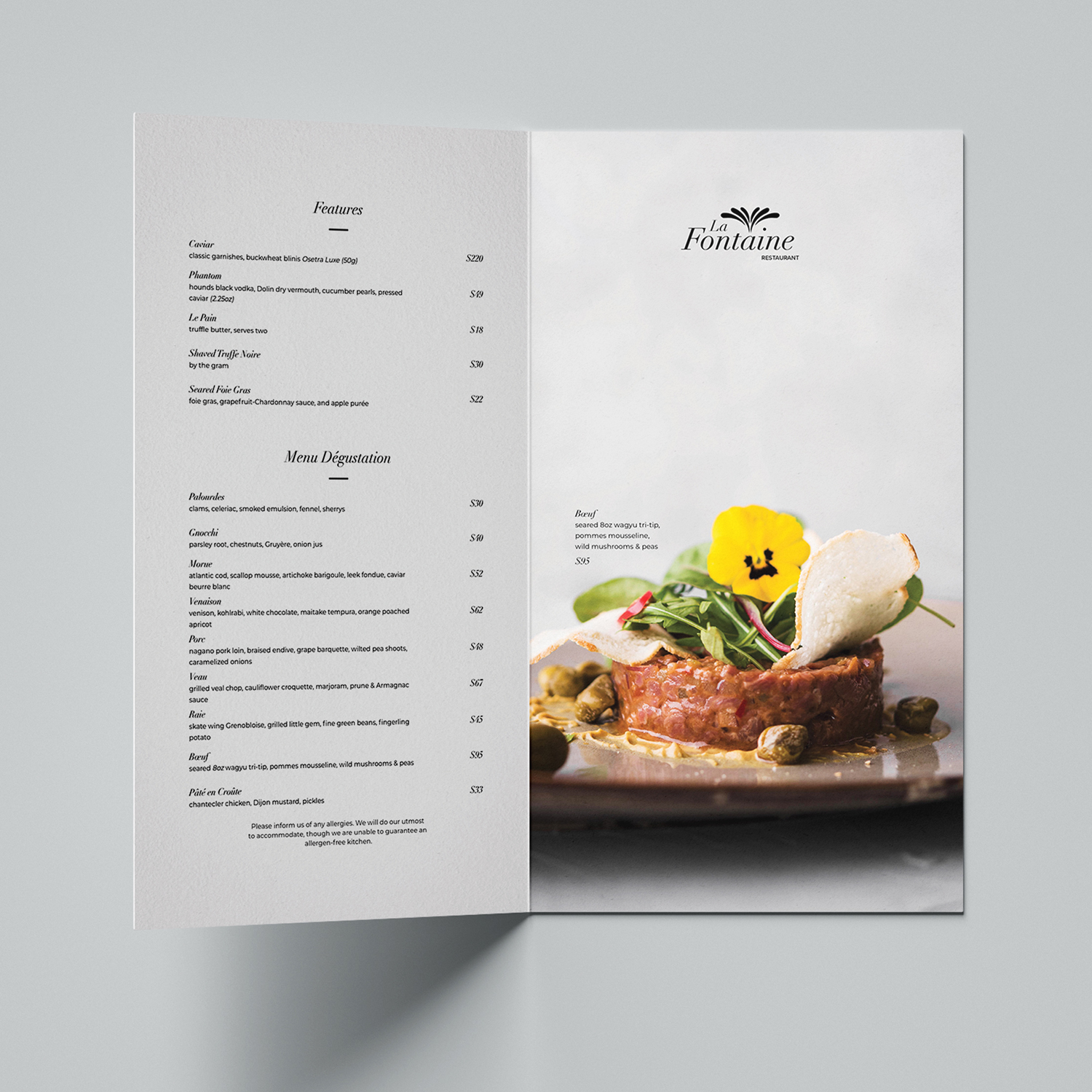 The next project was meticulously crafted for La Fontaine Restaurant, embracing a synergy of minimalism and sophistication. This thoughtful design approach is further elevated through the integration of printing techniques, including embossing and debossing methods.